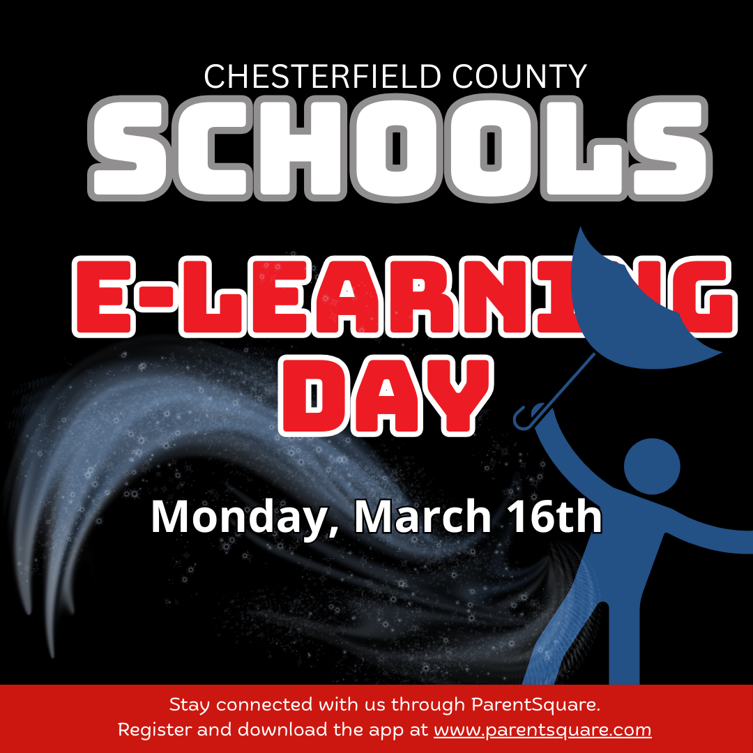 Chesterfield County School District will operate on an eLearning Day on Monday, March 16, 2026 due to severe weather expected in our area. All schools and district offices will be closed. All after school activities and athletic events scheduled for Monday are cancelled.